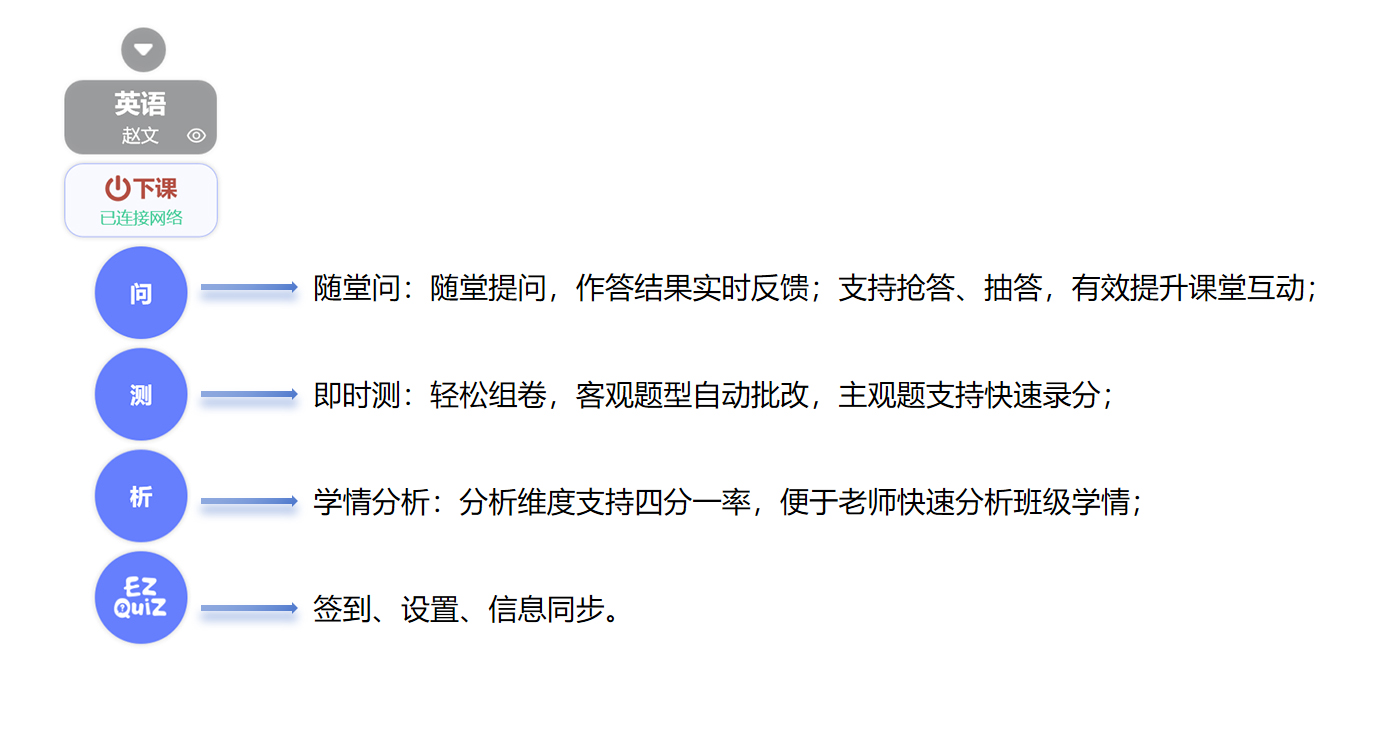 > >s **系统简介** >中天易教——教学效果即时反馈系统。产品专注于提高老师教学效率、加快老师对学生的成绩分析,能做到授课效果当堂反馈,班级测验成绩及时诊断。 > >i **01.中天易教授课端** > >i **02.中天易教云平台** > >中天易教后台网站yijiao.ezquiz.com,老师可进行备题组卷、学生学情分析等操作。 >i **03.中天易教小程序** > >“移动版”云平台,方便老师随时随地备题组卷、查看学情报表分析。